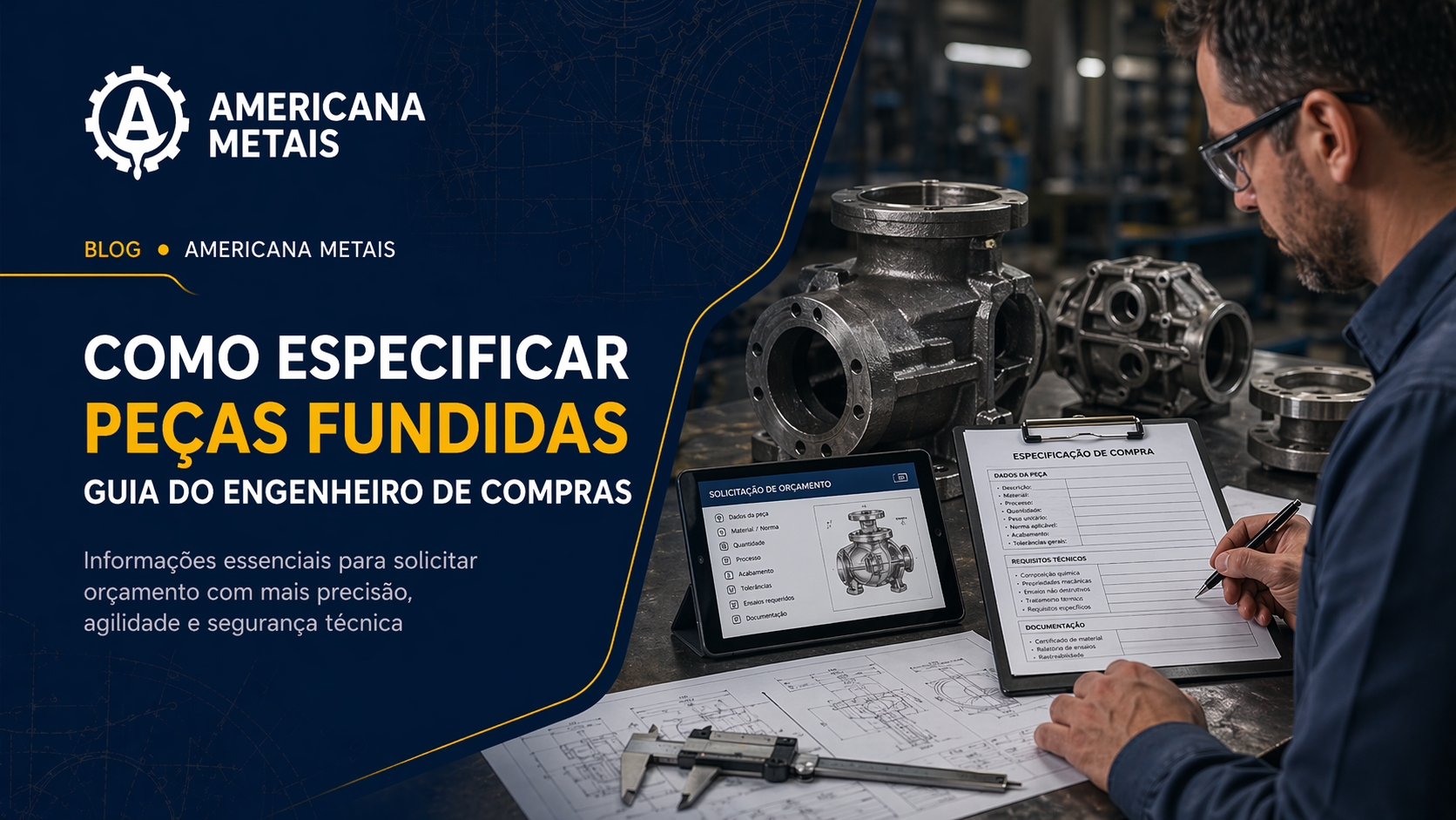 Uma especificação técnica incompleta ou incorreta é a causa número um de problemas no fornecimento de peças fundidas: orçamentos incomparáveis entre fornecedores, retrabalho por divergência dimensional, material inadequado para a aplicação e atrasos por informações faltantes. Este guia apresenta o que um bom documento de especificação deve conter — e por que cada item importa.